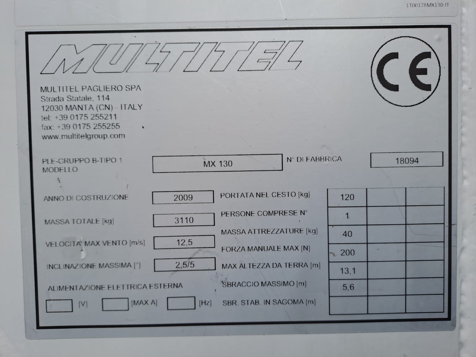 - modello Multitel Pagliero MX 130. Altezza 13 metri, sbraccio 6 metri. km 84000, veicolo molto corto e stretto.